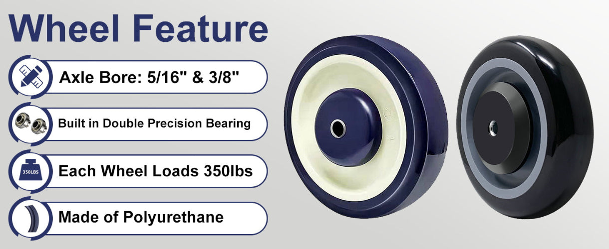 5" Polyurethane Shopping Cart Wheels Replacement Casters Wheels for Cart, 5/16" and 3/8"Axle 1200lbs Total Capacity